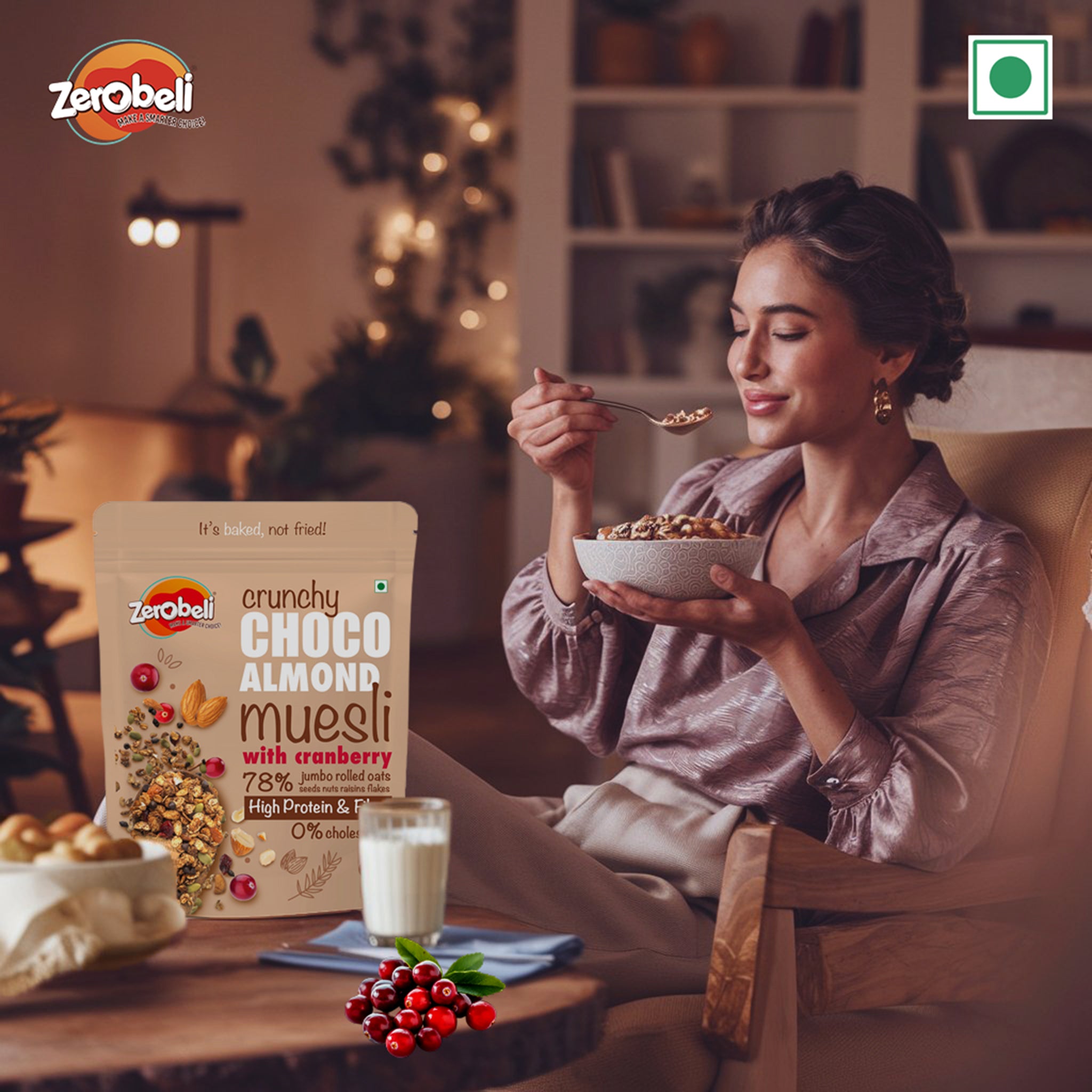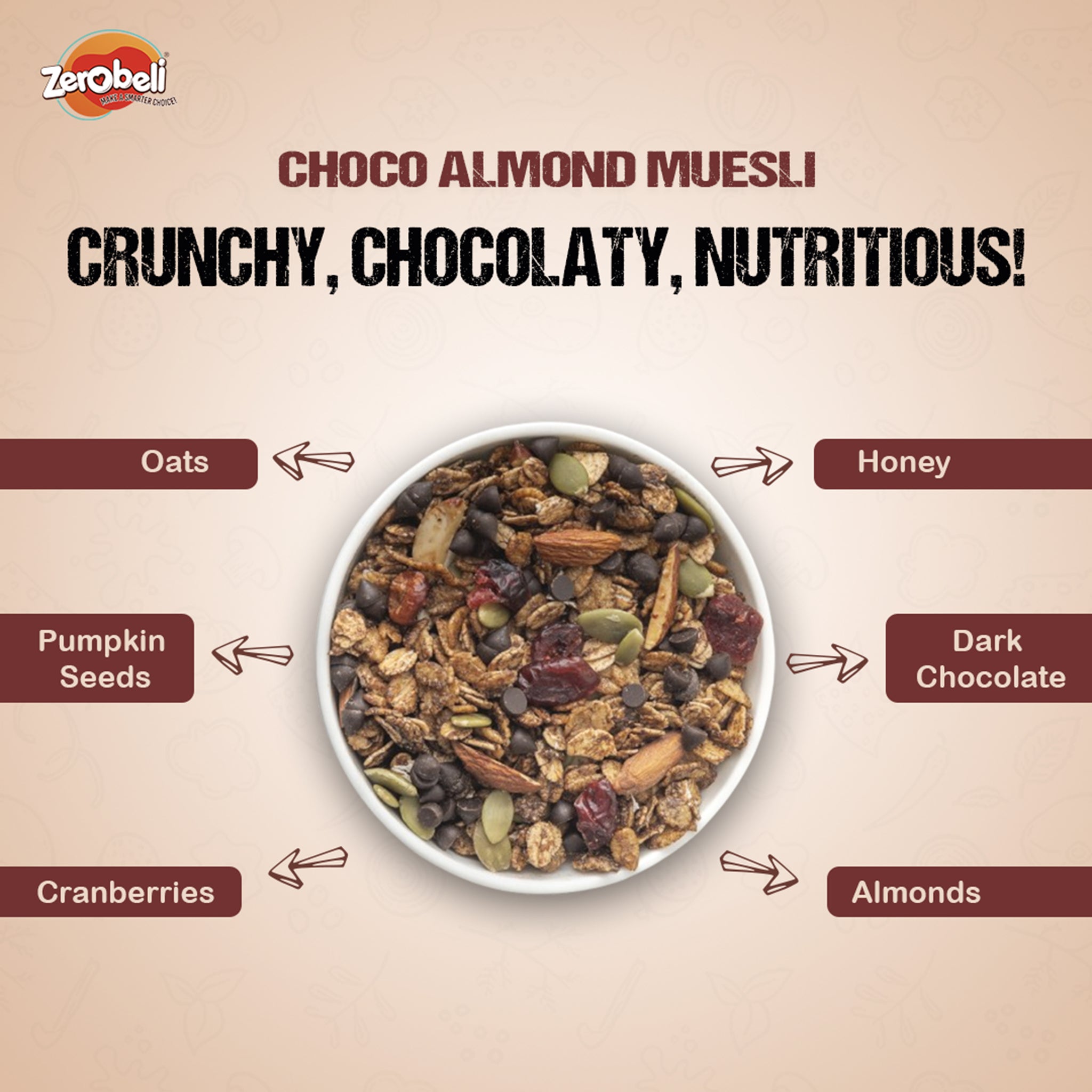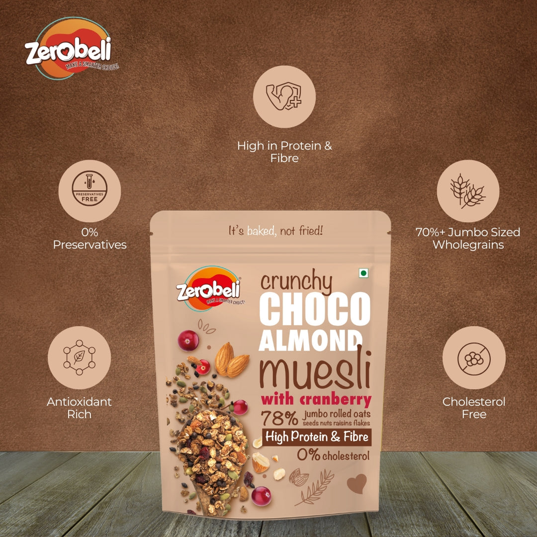 Our Muesli is a healthy mix of wholegrain like Oats flakes, Wheat flakes, Cornflakes, Almond, Pumpkin Seeds, Cranberry, Chocolate which are generously coated in cocoa to give a chocolatey taste in every bite . We strive to use high-quality ingredients to ensure a delicious and nutritious product. We manufacture in small batches, so that fresh muesli is served to you every day and every time.